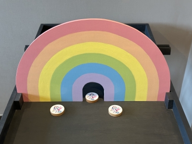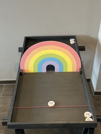Leg telkens 1 schietschijf tegen de elastiek, trek deze iets naar achter en laat los – zo glijd de unicorn onder de regenboog door. Ligt de schietschijf aan jouw kant? Pak hem dan op en probeer opnieuw te schieten. Wanneer alle schijven aan de andere kant liggen, heb je gewonnen!