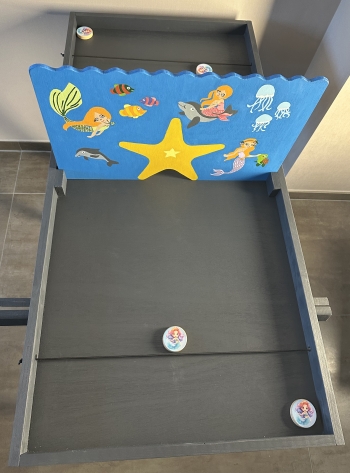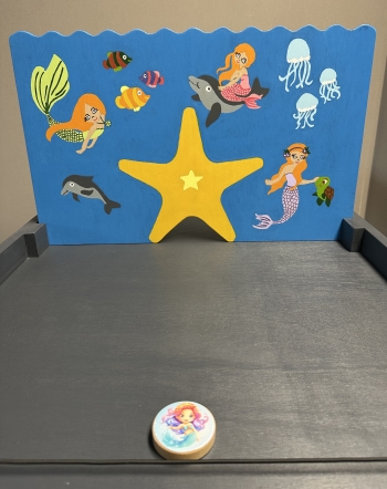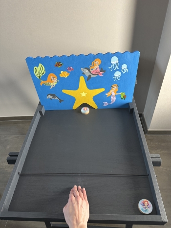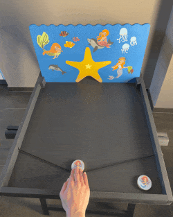 Leg telkens 1 zeemeerminschijf tegen de elastiek, trek deze iets naar achter en laat los – zo schiet de zeemeermin door het water. Ligt de zeemeerminschijf aan jouw kant, pak hem dan schiet opnieuw. Wanneer alle schijven aan de andere kant liggen, heb je gewonnen!