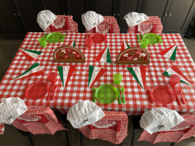 Om uw huis of feestlocatie om te toveren tot een Italiaanse pizzeria, bieden we tafeldecoratie aan zoals bordjes, bekers, bestek, een tafelkleed met het klassieke rood-wit geruite patroon, Italiaanse vlaggen, en decoratieve pizza's om het geheel compleet te maken.