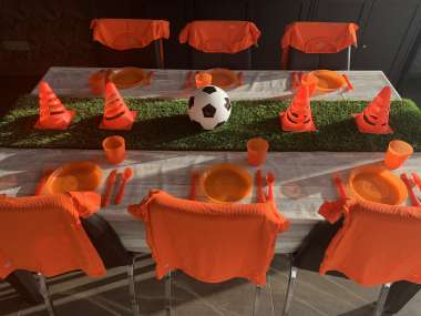 Trek het oranje shirt aan en verschijn aan een mooi gedecoreerde voetbaltafel met o.a. oranje bordjes, bekers en bestek, voetbal slingers, een grasmat voor op tafel en pionnen. Nu kan het sportieve feest beginnen.